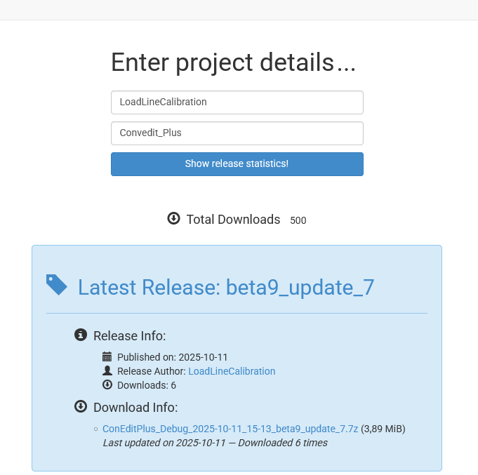 2. За всё время с момента первого релиза программу скачали с GitHub 500 раз. Наибольшее количество у версии бета 8 обновление 2 (202 скачивания) и у версии бета 9 обновление 4 (94 скачивания).