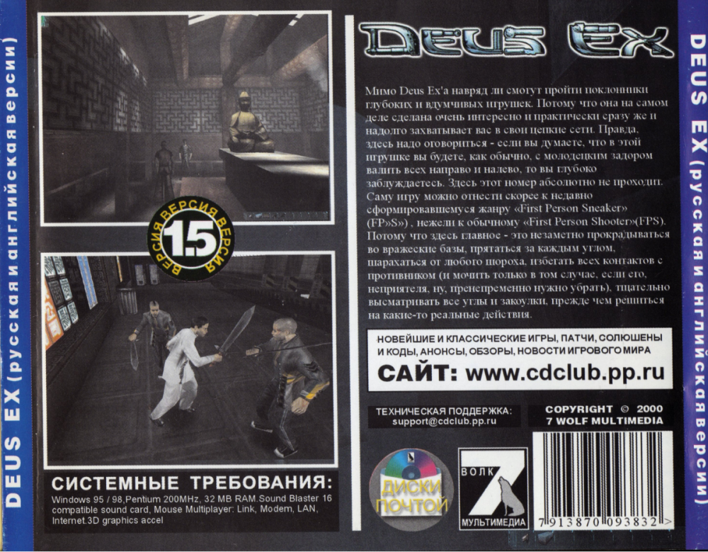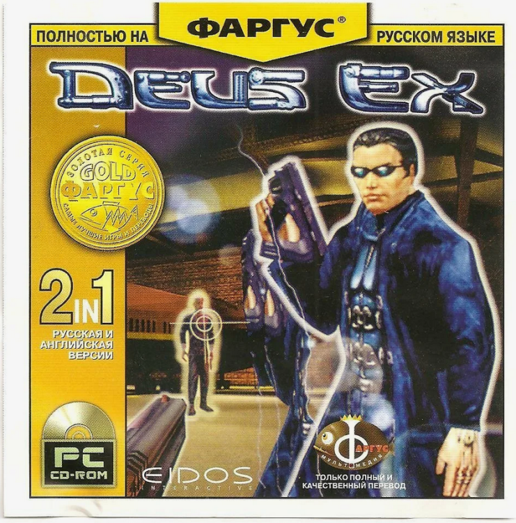 Ну я уже писал, конечно, тут давным-давно про первое знакомство... Как добрый дядя на Минском рынке в Ждановичах вручил мне диск с Деусом... Эх, вообще классное лето было... 2000 год... Выпускной класс впереди - СВОБОДНОЕ ЛЕТО от всяких экзаменов... вроде с Мамой ещё внезапно в Италию сгоняли аж на 21 день - на автобусе - прям по всей Европе - Польша, Австрия, Чехия. А после аккурат в Июле вернулись и я в деревню решил на пару-тройку недель ещё - к бабушке с дедушкой, ну и друзья там тоже приезжали. В один из дней дай думаю сгоняю на рынок в Минск - 10км всего от деревни - на автобус сел сутреца и вот он я с несколькими тысячами рублей в кармане - хоть убей не помню сколько там чего стоило тогда, но вроде чета типа 3-5 тыс за диск... Доллар чета около 1500-2000 бел рублей... Но эт не точно Ну и пошел по палаткам с дисками - смотрю молодой бородатый чувачок в футболке Хеви Метал чета там... запрягает потенциальному покупателю про новые шутеры - вот говорит из новинок Кисс Психо Циркус - прям отпад музыка-стрелялка - фанатам группы Кисс ваще... чувак такой не - мне че нить попроще да и не фанат... чувачок такой глядь на полку, ааааааааа ну вот чета ваще необычное - до утра играл - Деус Экс... тут и шутер и изучение и корпорации, но сложно!!! Чувак такой... не ну тоже чет не охота - скучно наверное... В общем чет потерся покупатель - не помню что взял, но чёт взял точно может не из новинок... Я следом спрашиваю ну-ка дайте мне Деус этот глянуть - там диск Фаргус, но на деле не фаргус оказался, а закос под него - внутри цветная накатка (я его с тех порыпытался найти т.к. потом у меня его увели само собой), а на диске самая первая версия 7го волка без озвучки. Вот такой: Реальный Фаргус был такой вот потом - это тот, где сложности римскими цифрами перевели I -II- III - IV =): А у Волка потом вышла 1,5 версия такая с озвучкой. Вероятно была и первая такая же, но мне попался оборотень в виде Фаргуса =): Ну потом ещё было пару редизайнов у волка (в белом я себе оставил на память - не потерял скорее), но суть что вот у версии 1,5 обложка такая же как у моего типа Фаргуса и описание сзади тоже 1 в 1. Вот это: И вот даёт парняга мне диск - я читаю... офигиваю приятно что мне тут подают и конечно же безоговорочно беру... Но не забываю и про Кисс Не то чтобы фанат, но слушал иногда у бати пластинку Династию альбом... После Игры я стал их фанатом и скупил все альбомы на дисках, а с недавних пор и почти всё на виниле стараюсь собрать. Кисс уже реальный Фаргус был да озвучкой: В общем довольный отдал денюжку парняге за 2 свеженьких диска отправился в деревню... Всю неделю я перечитывал текст и рассматривал скриншоты... думая что там за игра такая... Интернета мобильного не было же Комп дома в городе конечно же - СВЕЖЕНЬКИЙ пентиум 3, 500 мгц, 128 озу, РиваТНТ2 32 метра... Ну Деус в 1024на768 шел неплохо (но Халфа т Анрил лучше кнечно работали), но в Гонк-Конге приходилось до 640на480 скидывать или 16битный цвет врубать... а ещё у мя звуковая карта Ямаха была - в наушниках просто сок с улиц Деуса лился в уши Музыка! ЗВУКИ! ГОЛОСА!!! Вернувшись домой поставил обе игрухи и ворвался... сперва в Кисс поиграл - очень понравился дизайн + графика + озвучка + муууузыка. Прошёл я её буквально за несколько дней. Потом ещё за годы не раз переигрывал чисто ради фана - сюжет там для галки-то... но интересно секреты искать было. Ну и альбом одноимённый слушал само собой. Деус оставил напосле