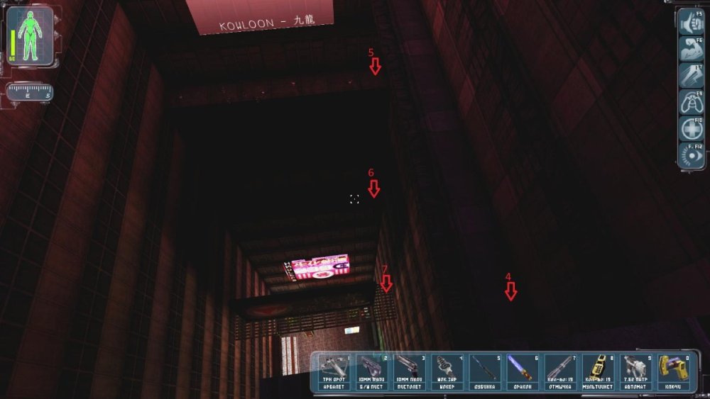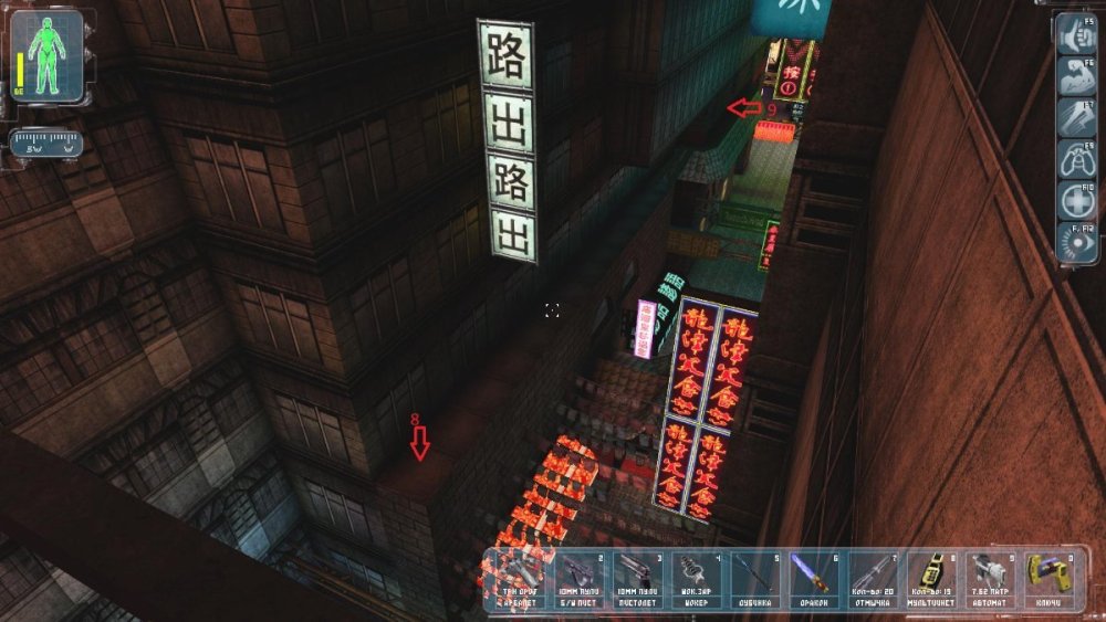 Гонконг, первое посещение, район где по заданию нужно посетить женщину(Меги Чоу) и расспросить о пропаже меча. Прямо напротив входа в отель есть проход с лифтом в конце. Нужно подняться на лифте, потом пробежать и залезть по лестнице на самый верх. Там еще находится убежище пилота вертолета. Далее аккуратно спрыгнуть вниз, это и будет точка#1 на скрине. Потом по маршруту на скринах аккуратно спуститься на точку#7. Можно без навыков прыжков, везде допрыгивается и не смертельно. На точке#7, за рекламным щитом будет отмычка + батарейка. Далее спуститься и залезть в окно на точке#9, там будет аптечка+патроны+отмычка. -